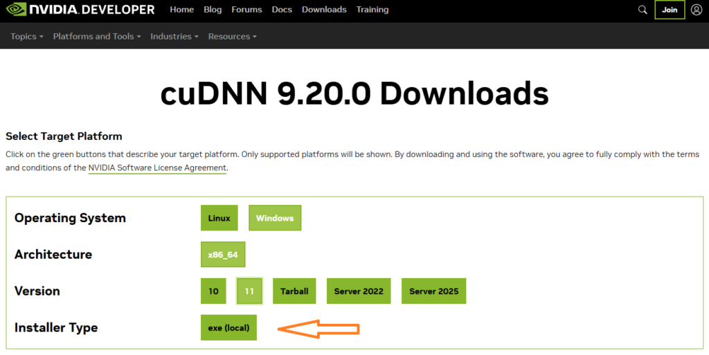 Download and install NVIDIA CUDA Deep Neural Network library cuDNN version 9.20.0.
