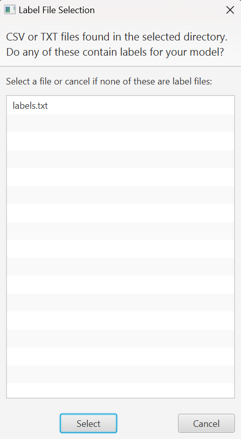 - Autofill: When you choose a model directory, Intelligence will check for txt and csv files within the directory and ask if any of them is your labels file.