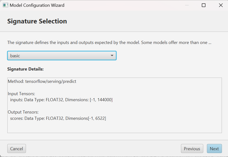 The model signature defines the data type and dimension of the input and output data of the model. Some models provide more than one signature. On this screen, use the dropdown to select the signature that contains classification scores. It may be called something like “basic”, “scores”, or “labels”. It should have at least one output tensor with a last dimension equal to the number of labels (e.g., 6522).