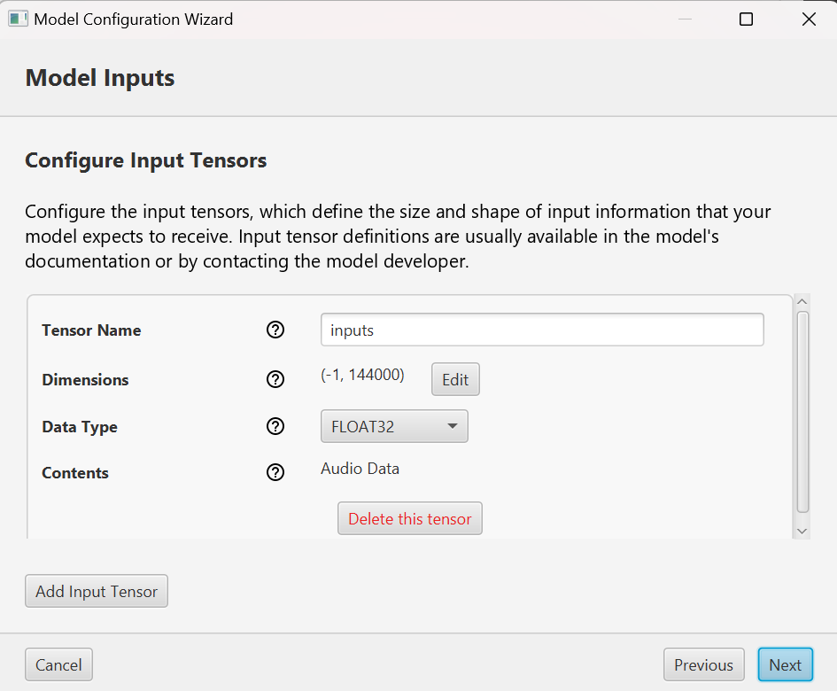 On this screen, check the configuration of the input tensors defined by the model signature. If your model only takes one tensor of audio data, all info on this screen should be automatically filled. Otherwise, you may need to manually input some values.