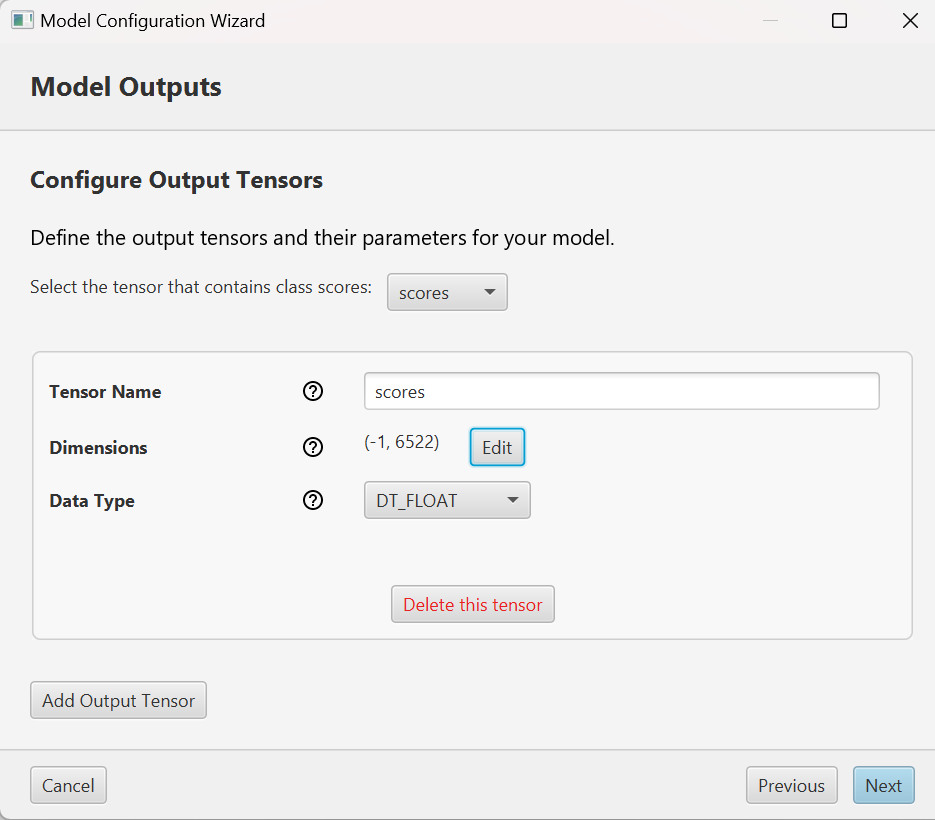 This screen is basically similar to the previous Model Inputs screen, with the addition of one dropdown at the top where you should select the tensor that contains the classification scores. It may be called something like “scores” or “classes” and should have a final dimension equal to the number of labels.