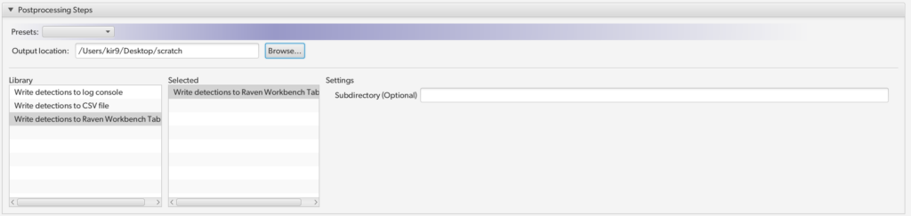 Choose what is done with the model outputs. Currently there are only three options – writing detections to a Raven Workbench table, CSV file, or the debug log. If you want to save the results of your run, you should include either CSV or table export, or both. You can select which steps are included by moving them from “available steps” into “included steps” and also reorder them by dragging.